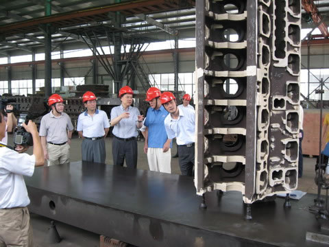 圖為陳敏爾常務副省長在集團董事長朱金根、副總方毅和杭機鑄造總經理鄭金濤陪同下參觀鑄件成品車間現場。