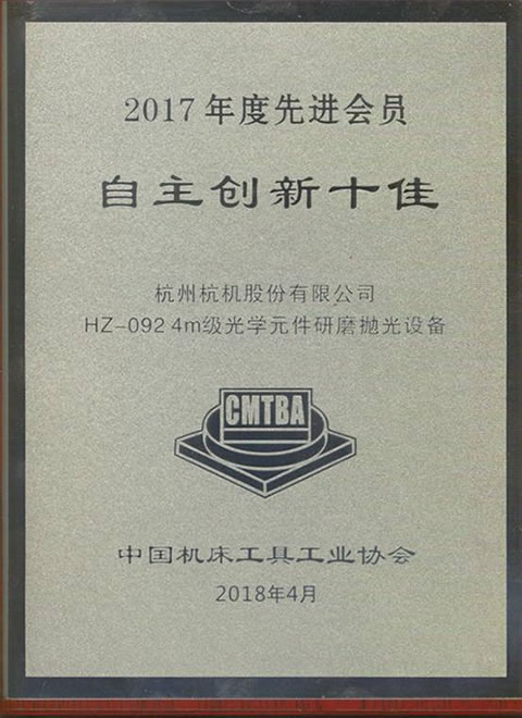 2018年4月,中國機床工具工業協會開展了2017年度中國機床工具工業協會先進會員(十佳)表彰活動,我公司憑借“HZ-092 4米級光學元件研磨拋光設備”項目榮獲2017年度中國機床工具工業協會“自主創新十佳”稱號。
